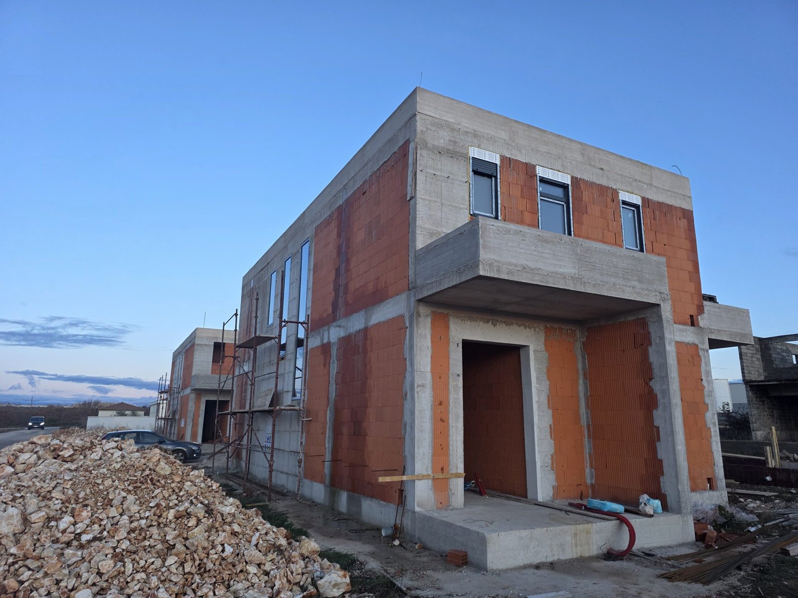 Stambeni objekt u fazi izgradnje, projektiran kao funkcionalna i energetski učinkovita cjelina. Radovi obuhvaćaju kompletnu grubu gradnju, pripremu fasade i usklađivanje svih elemenata konstrukcije za nastavak završnih radova. Fokus je na kvalitetnoj izvedbi, ravnim linijama i pouzdanim rješenjima koja osiguravaju dug vijek trajanja i ugodno stanovanje.