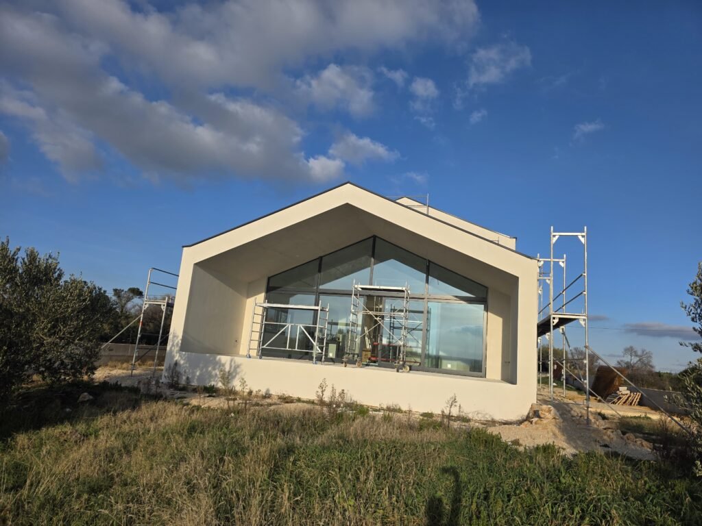 Moderna obiteljska kuća u izgradnji, s naglaskom na čiste linije, velike staklene površine i kvalitetnu završnu obradu. Projekt uključuje konstrukcijske radove, fasadu i pripremu objekta za završne faze, uz preciznu izvedbu i poštivanje tehničkih standarda. Posebna pažnja posvećena je detaljima i dugotrajnosti materijala, kako bi objekt bio funkcionalan i estetski usklađen s okruženjem.